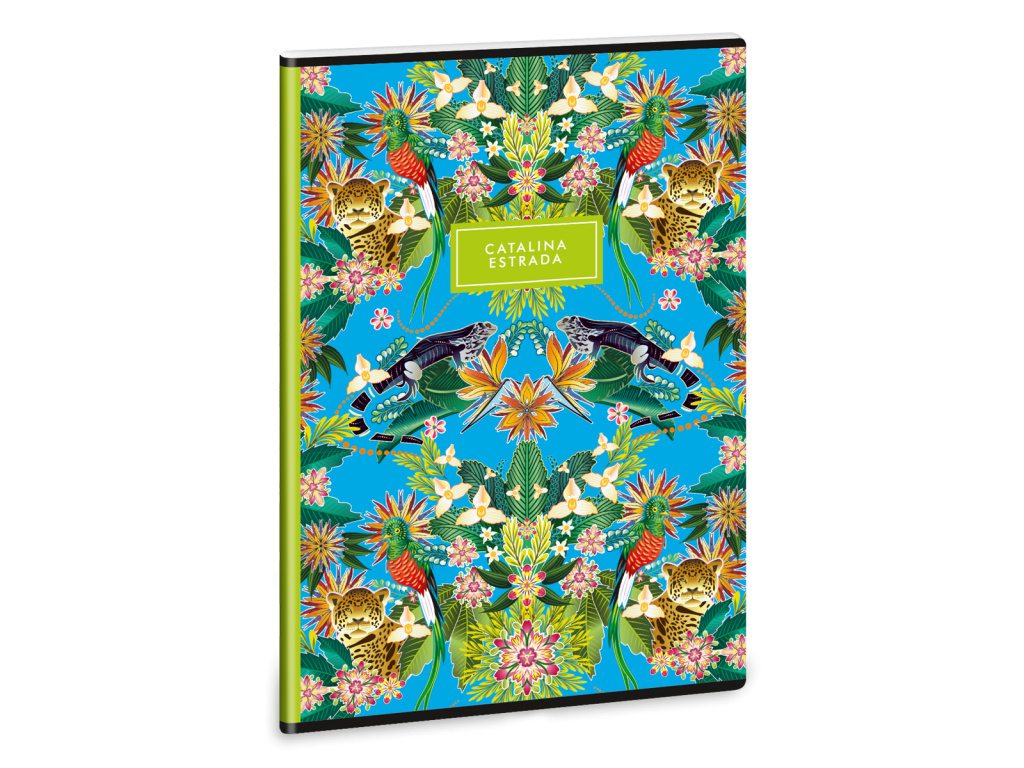 A lined high-quality notebook from the Catalina Estrada Iguana Jungle collection by Ars Una in A4 format. The cover of the notebook is made of 300 gsm paper with 3D-UV matte and glossy foil (some elements are shiny and give the notebook a luxurious look). The lines have blue color and are 7 mm apart.