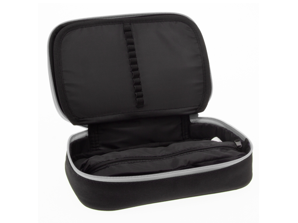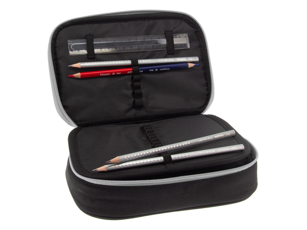 There are two sections inside the pencil case. The first section contains rubber slots for a ruler and 18 crayons. In the second chamber, you will find 12 slots for markers, crayons, pencils or pens on one side and on the opposite side a zipped pocket together with rubber slots for a sharpener and an eraser.