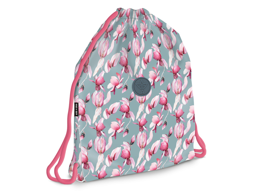 A drawstring bag with a high-quality printed design from the Rosy Magnolia collection.