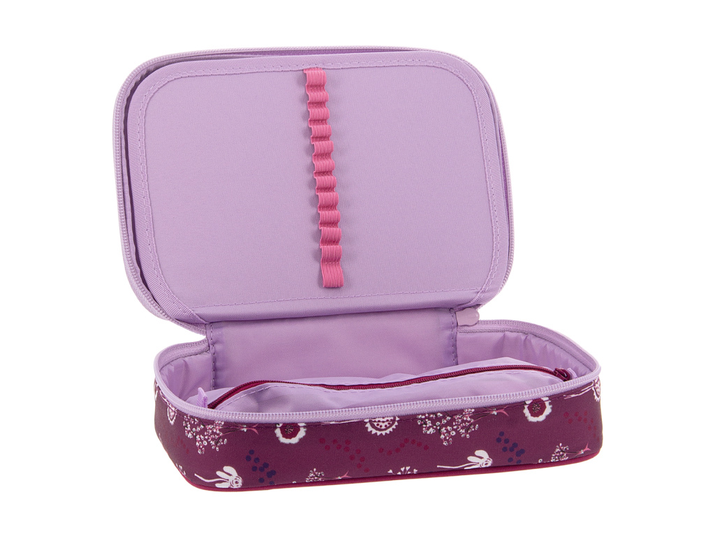 Uvnitř pouzdra se nachází dvě patra. V první komoře se nachází gumičky na pravítko a poutka pro 18 pastelek. V druhé komoře naleznete 12 poutek na fixy, pastelky, tužky či propisky na jedné straně a na opačné kapsičku na zip společně s gumičkami na ořezávátko a mazací gumu.
