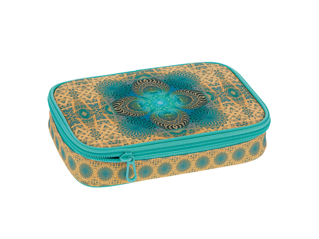 Uvnitř pouzdra se nachází dvě patra. V první komoře se nachází gumičky na pravítko a poutka pro 18 pastelek. V druhé komoře naleznete 12 poutek na fixy, pastelky, tužky či propisky na jedné straně a na opačné kapsičku na zip společně s gumičkami na ořezávátko a mazací gumu.