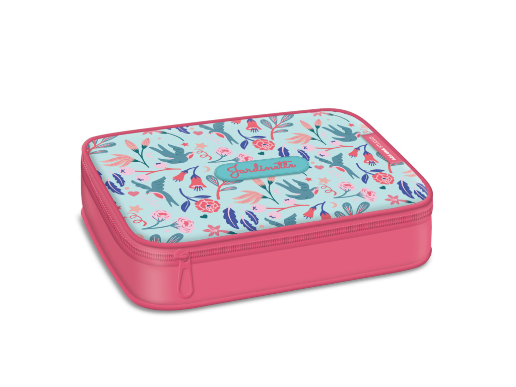 Prostorný školní penál z kolekce Jardinette od výrobce Ars Una s jednou zipovou kapsou a rozměrným úložným prostorem uvnitř. Pouzdro se uzavírá pomocí zipu s kovovým poutkem pro lepší manipulaci.