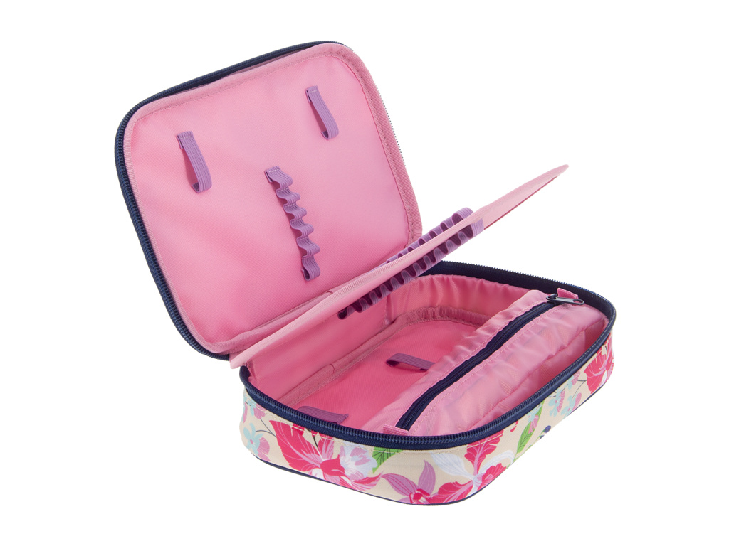 Uvnitř pouzdra se nachází dvě patra. V první komoře se nachází gumičky na pravítko a poutka pro 18 pastelek. V druhé komoře naleznete 12 gumiček na fixy, pastelky, tužky či propisky na jedné straně a na opačné kapsičku na zip společně s gumičkami na ořezávátko a mazací gumu.