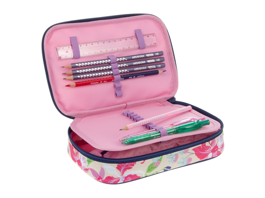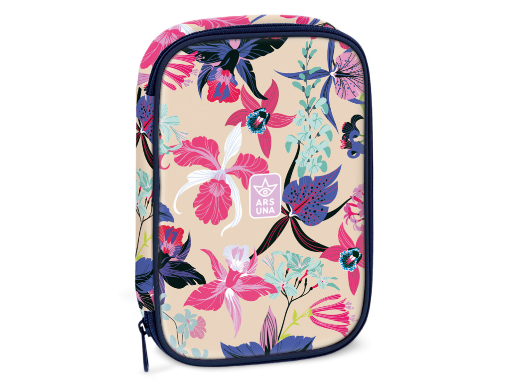 Prostorný školní penál z květinové kolekce Beach Flowers od výrobce Ars Una s jednou zipovou kapsou a rozměrným úložným prostorem uvnitř. Pouzdro se uzavírá pomocí zipu s kovovým poutkem pro lepší manipulaci.