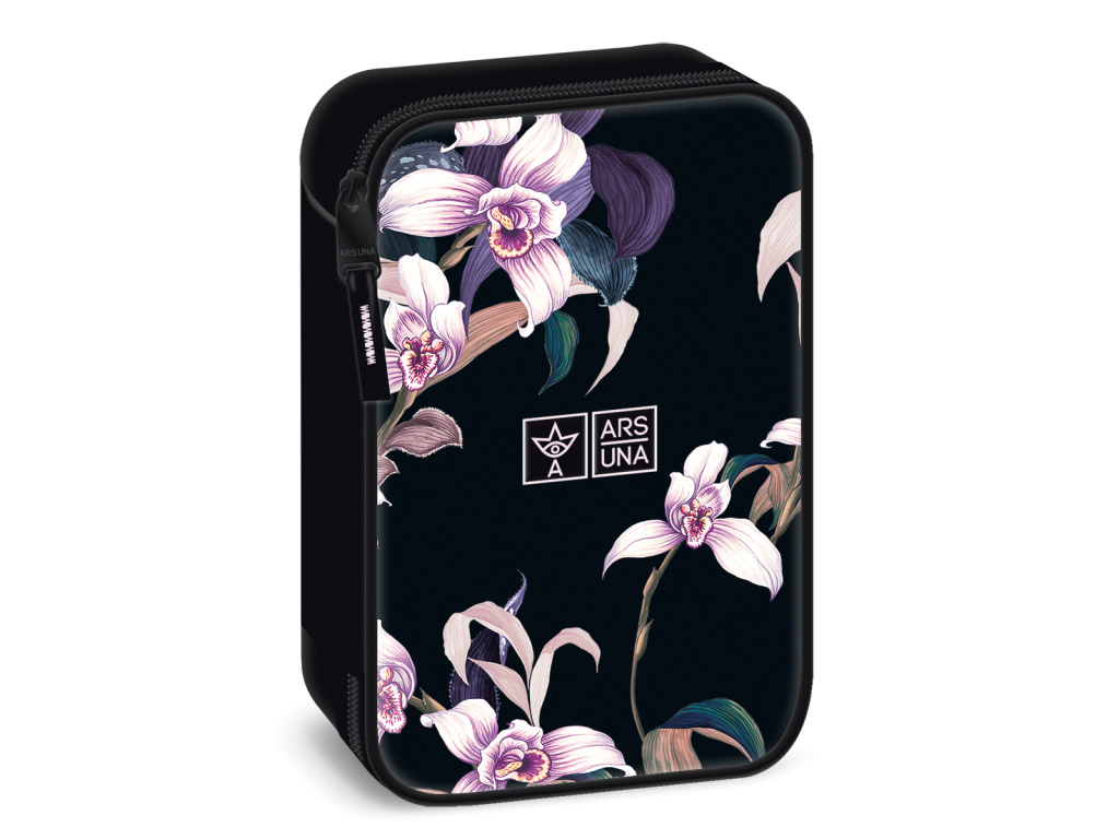 Prostorný školní penál z květinové kolekce Orchideje od výrobce Ars Una s jednou zipovou kapsou a rozměrným úložným prostorem uvnitř. Pouzdro se uzavírá pomocí zipu s kovovým poutkem pro lepší manipulaci.