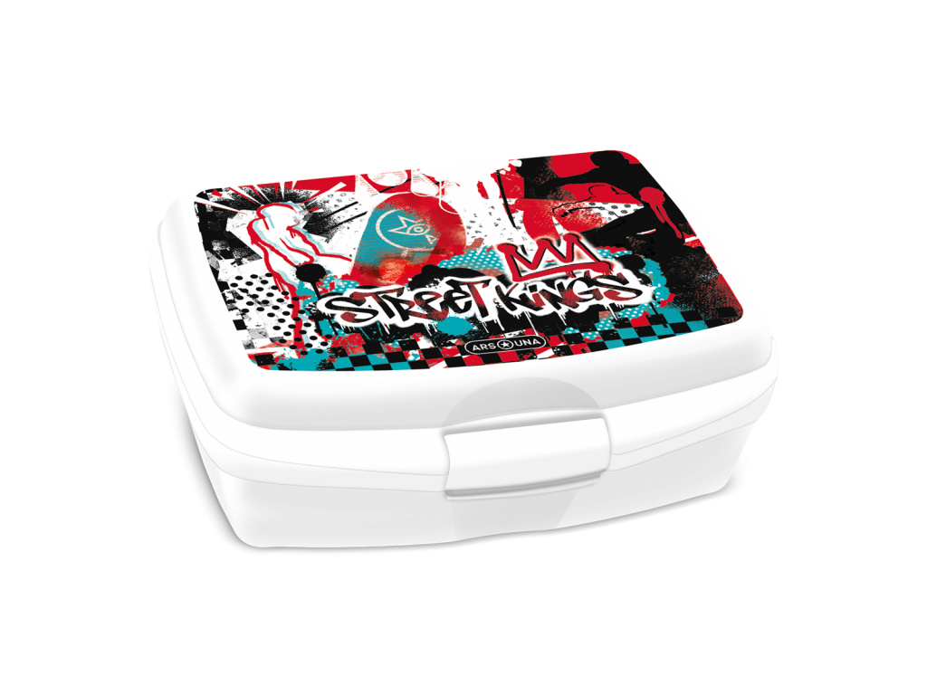 Box na svačinu z kolekce Street Kings v bílé barvě s motivem graffiti a zacvakávacím poutkem k uzavírání, vhodný pro chlapce.
